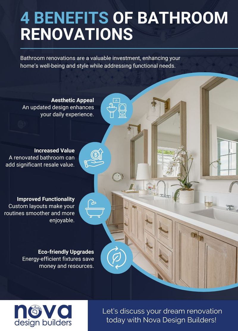 Renovating your bathroom is a worthwhile investment that enhances aesthetics, increases your home’s value, improves functionality, and boosts energy efficiency. At Nova Design Builders, we specialize in customizing bathroom designs tailored to your unique needs. Perfecting your bathroom is just a renovation away—contact us today to get started on your dream bathroom!